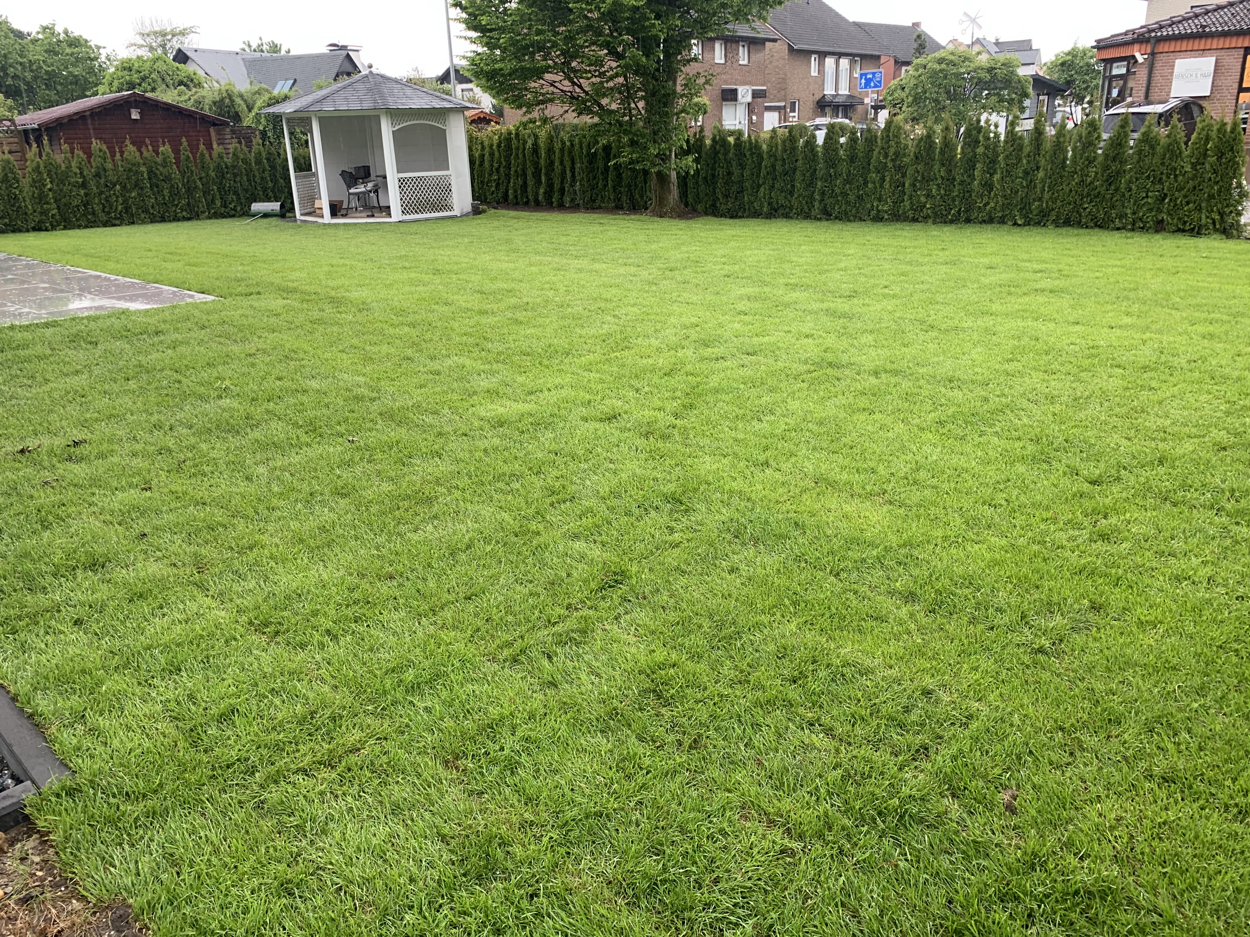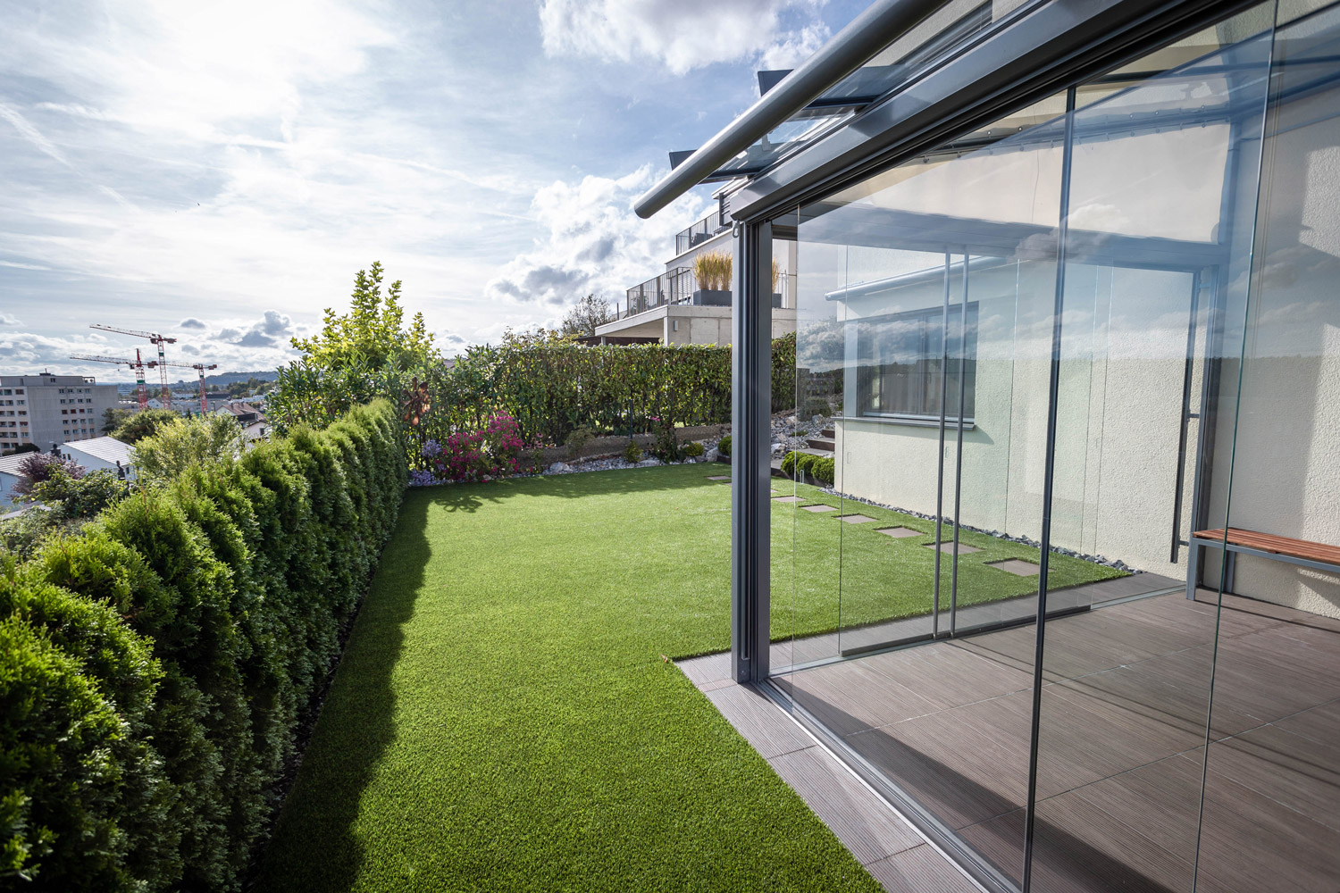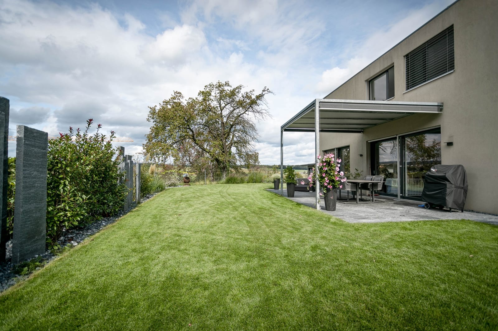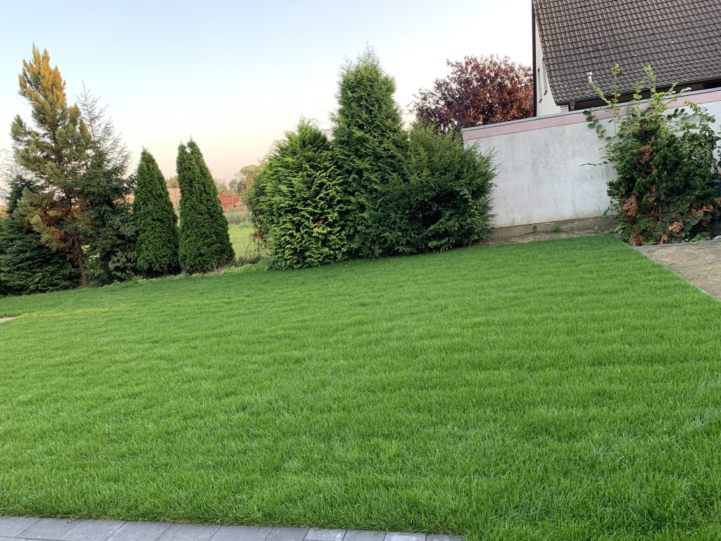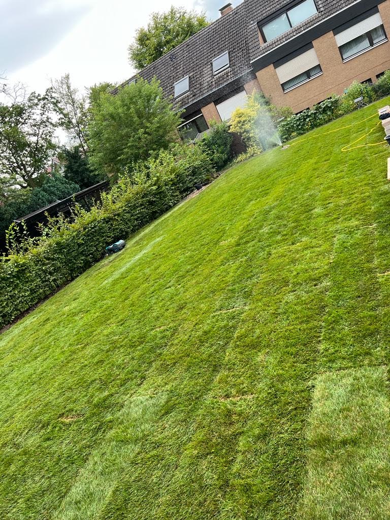 Rollrasen, Kunstrasen, Bewässerungsanlagen, Heckenpflanzen und Rasenmäherroboter schaffen eine pflegeleichte, grüne Oase und sorgen für einen perfekten Garten.